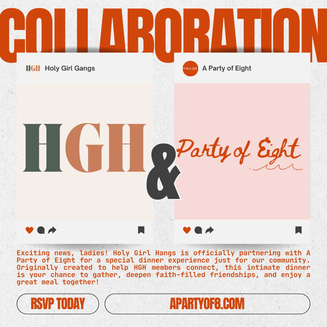 If you’ve been trying to find a way to connect with a smaller group of HGH ladies, this is your chance! We’re collaborating with A Party Of 8 to bring you intimate dinner parties where you can connect with other ladies on faith and life! Reserve your seat to enjoy a great meal and even better company! Visit https://www.apartyof8.com/ to reserve your seat and remember to use the code “HolyGirlHangs” at checkout!